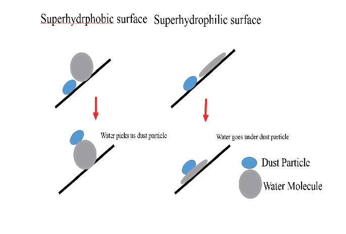 โดยสำหรับวัสดุที่ทางผู้ผลิตนำมาใช้ในการเคลือบผิวนั้นมีหลายชนิดด้วยกันโดยหนึ่งในชนิดที่เป็นที่นิยมก็คือสารประกอบซิลิกา (Silica compound) ซึ่งเป็นสารที่มีคุณสมบัติที่เรียกว่า “Super Hydrophilic” หรือ “ความชอบน้ำอย่างยิ่งยวด” ซึ่งคุณสมบัตินี้เองจะทำให้โมเลกุลของซิลิกาสร้างมุมตกกระทบ (contact angle) ระหว่างพื้นผิวของตัวมันเองกับโมเลกุลของหยดน้ำที่มีขนาดที่น้อยมากๆ (ประมาณ 5 องศา, หยดน้ำ b ในภาพที่ 2) ทำให้หยดน้ำมีลักษณะคล้ายฟิล์มมีความบางมากๆ ซึ่งด้วยความบางนี้เองทำให้ขณะที่ฟิล์มหยดน้ำเหล่านี้ไหลลงมาตามแรงโน้มถ่วงก็จะสามารถที่จะแทรกตัวเข้าไปด้านใต้ของโมเลกุลของฝุ่นหรือสิ่งสกปรกต่างๆและดึงโมเลกุลเหล่านั้นให้ไหลลงจากหลังคาไปพร้อมกันนั่นเอง (ภาพที่ 3)